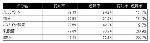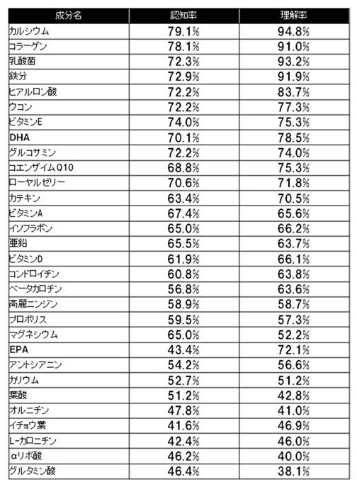 調査対象に、「名前」を知っている成分と、その知っている成分の「期待される効能」を