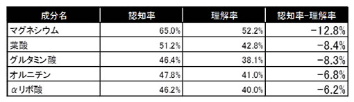 名前を知っている、と回答した回答者のうち、その期待される効能を「知らない」と答えたその差分が大きい成分は、「マグネシウム」。その差は12.8%。